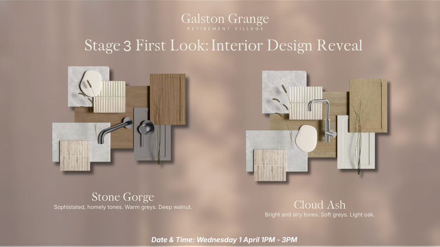 This relaxed preview event is designed for downsizers who want to see the Stage 3 interior direction and understand the practical details that matter before making any decisions. You’ll have time to ask questions, compare options, and get a clear feel for the lifestyle and home design in person.