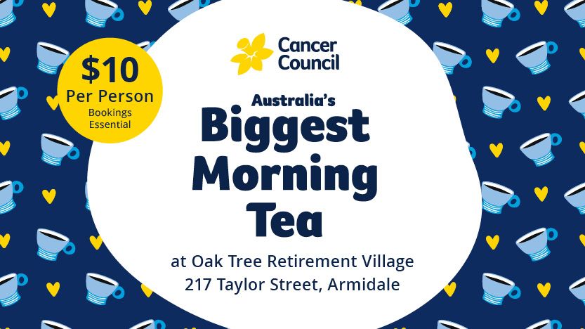 You are invited to our Biggest Morning Tea, hosted by Oak Tree Retirement Village, Taylor Street.