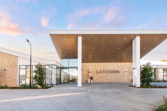 The largest of Palm Lake Resort Paynesville’s current floorplans, the 227m2 Thomson is a three-bedroom design with a statement street presence. A high peaked roof above the front porch and an impressive glass front door, framed by a fixed glass panel reaching into the roofline, create a grand and light-filled entry. Inside, the open-plan layout begins with a spacious living area flowing into the kitchen and dedicated dining space, while a centrally located tiled alfresco connects to three sides via large sliding doors, extending the home’s living space and enhancing its bright, airy atmosphere.