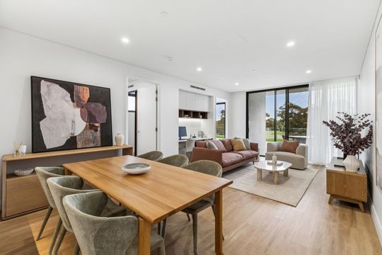Inside the home, an open-plan living and dining area seamlessly integrate with a contemporary kitchen equipped with stone benchtops and modern appliances.