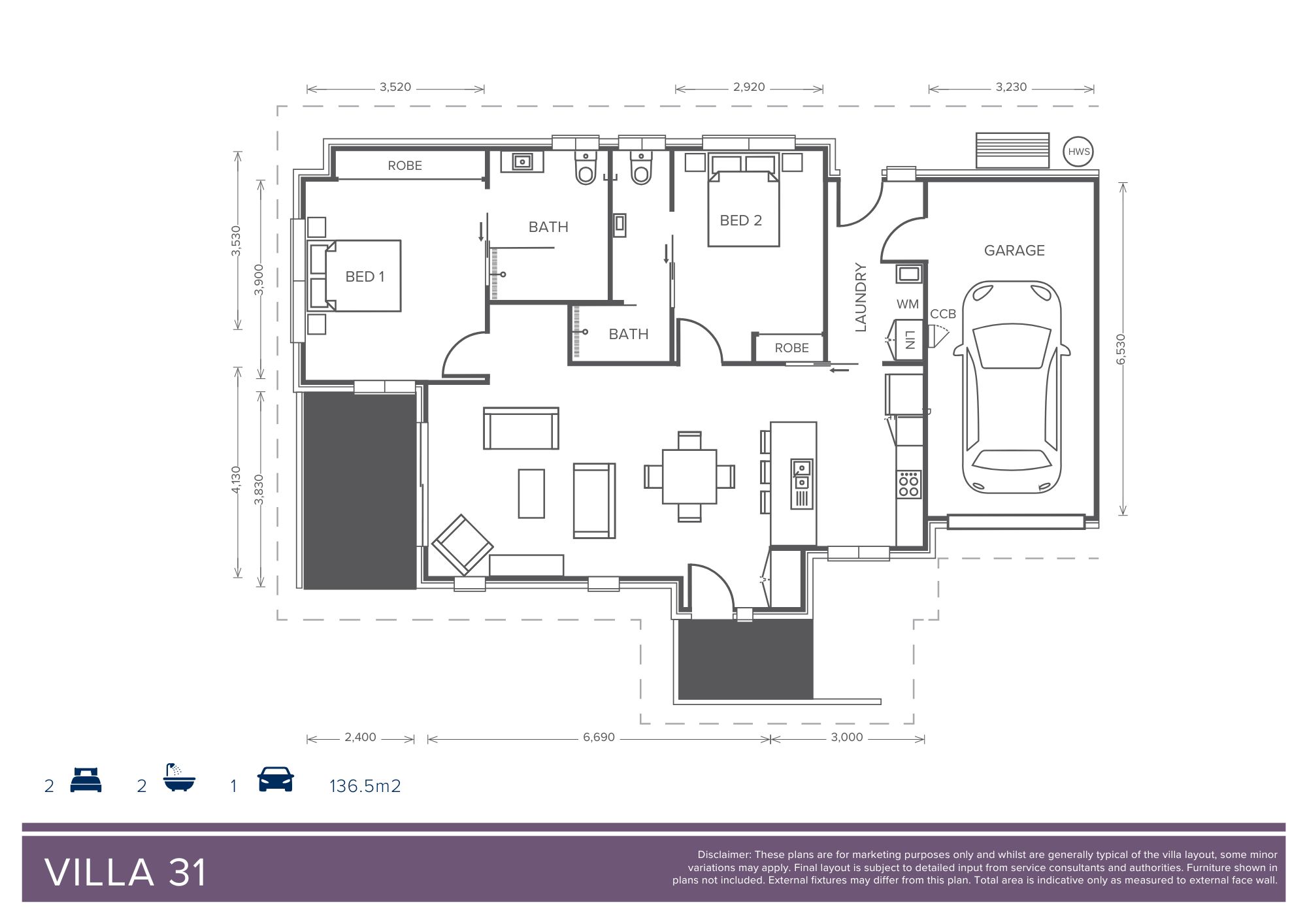 Villa 31 - The Thorne design is an open plan, 2 bedroom, 2 bathroom villa with a full sized kitchen and private outdoor area.